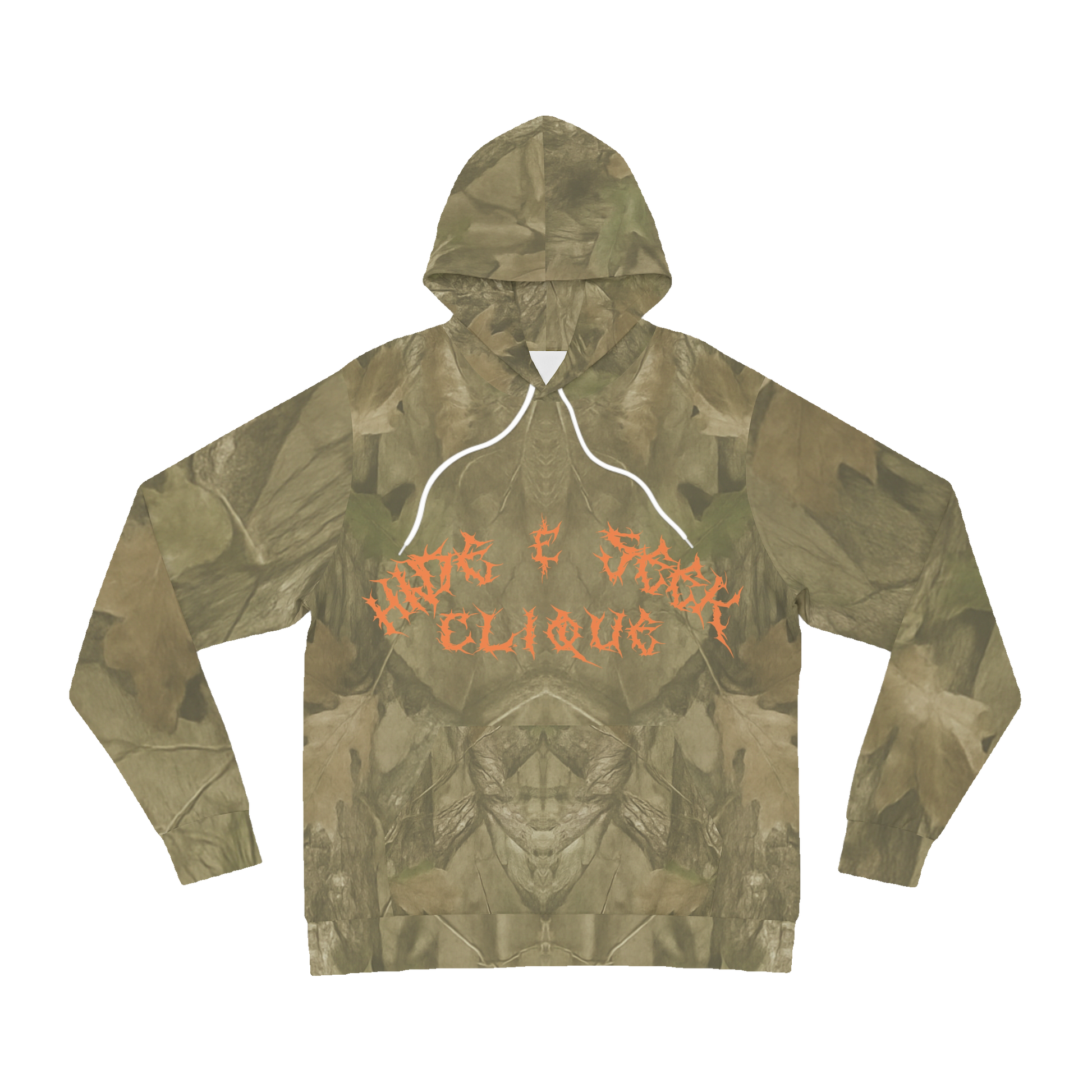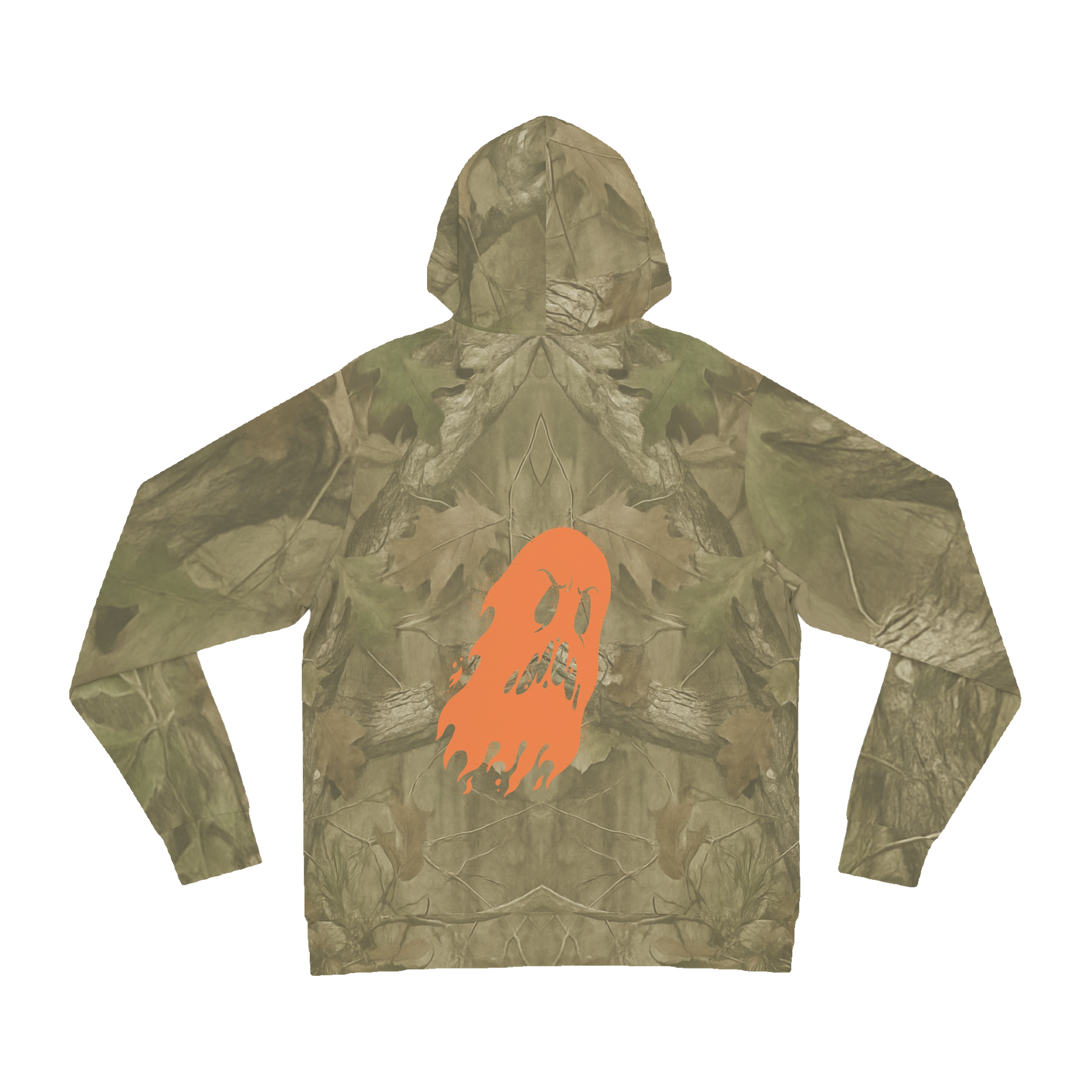 The MOSS OPS HOOD from the GHXST DIVZN series merges classic woods camo with covert street identity. Featuring an all-over tactical camo print, blazing orange HIDE & SEEK CLIQUE glyphs across the chest, and a scorched ghost icon on the back—this hoodie is built for those who move undetected.