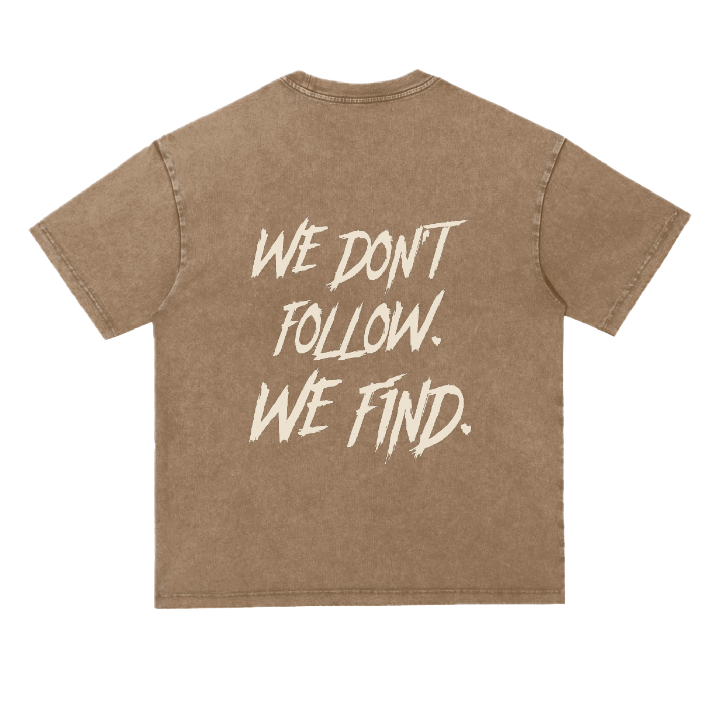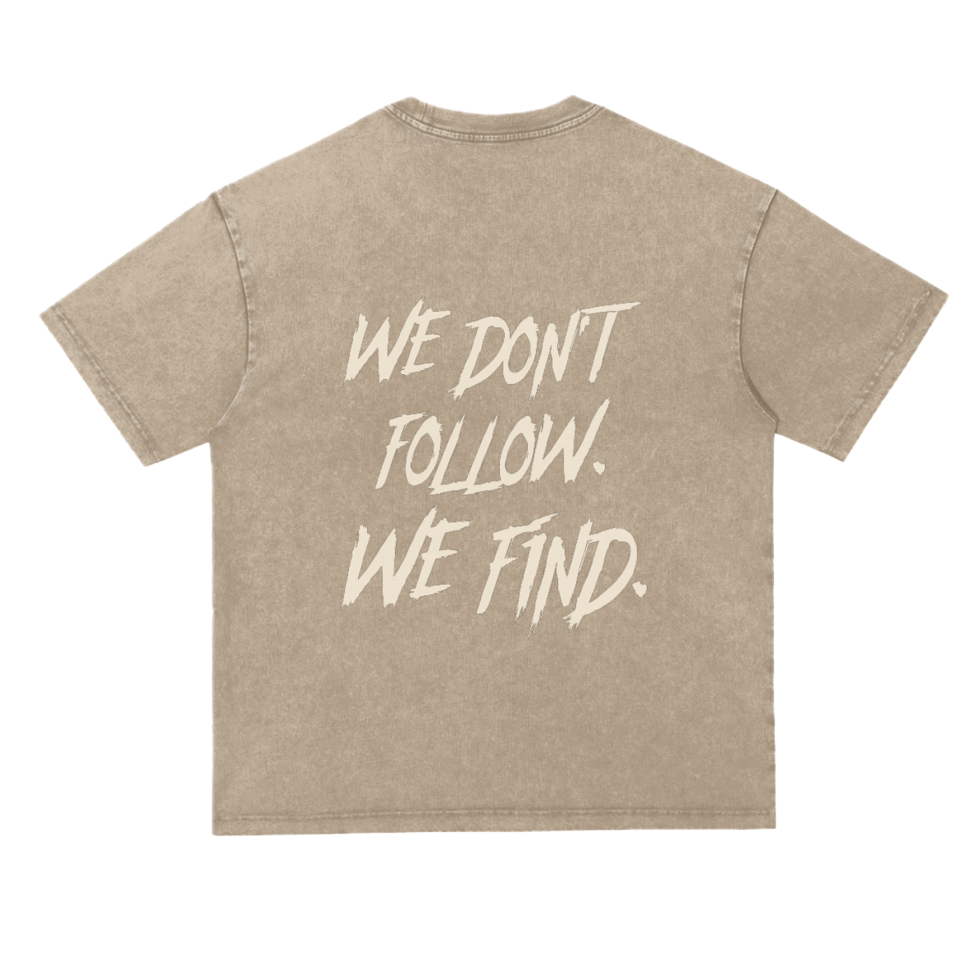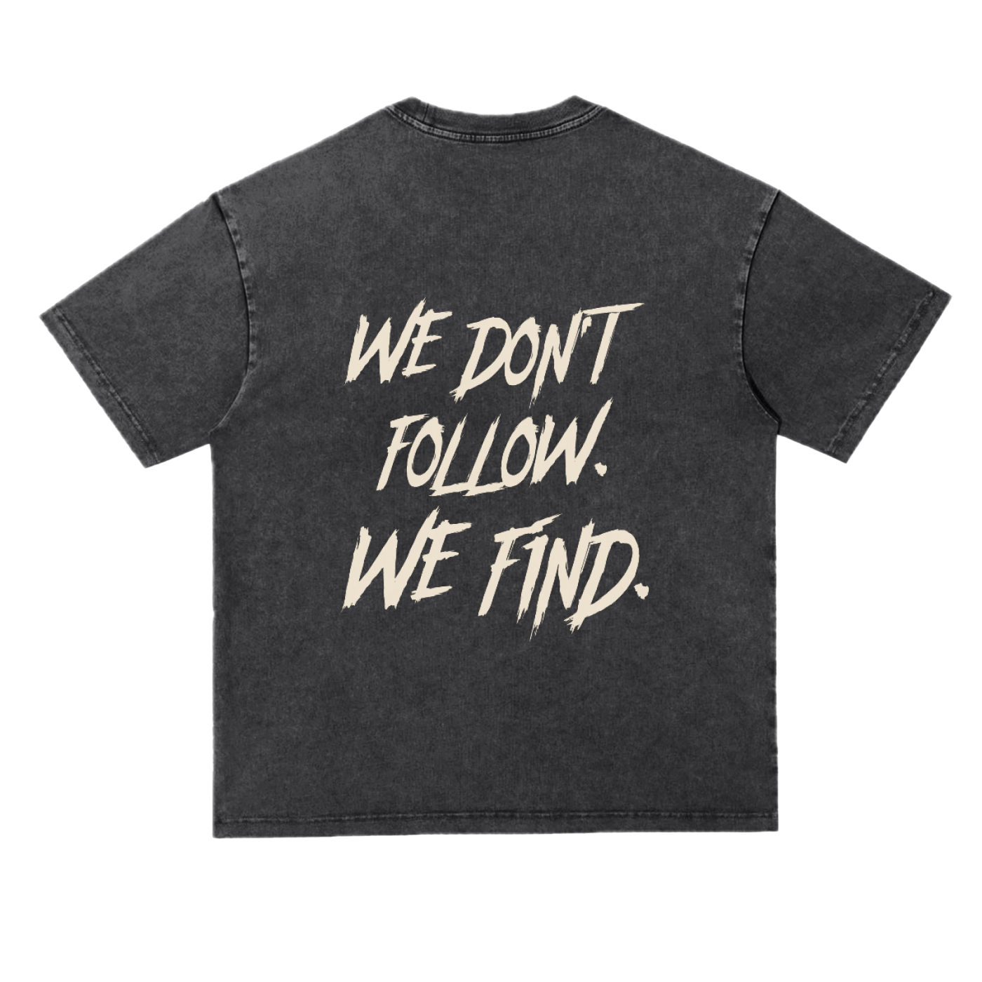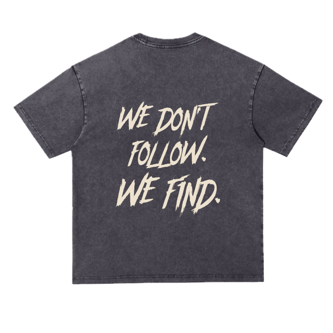 Signal received. Transmit your frequency in this heavyweight 300 GSM acid-washed tee—crafted for durability, dropped shoulders, and effortless edge. Featuring our “WE DON’T FOLLOW. WE FIND.” declaration stamped loud on the back, this piece is built for those who move off-grid and on-purpose. Now tagged with the official “HIDDIN ≠ SEEKER” inner mark — proof you found it